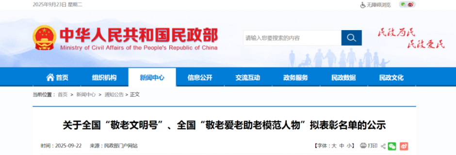 近日,2025年全國敬老愛老助老活動評選委員會辦公室發布《關于全國“敬老文明號”、全國“敬老愛老助老模范人物”擬表彰名單的公示》,惠州市4個集體、6名個人擬獲表彰。