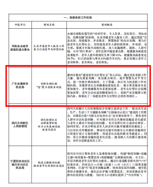 經(jīng)過地方申報、省級老齡工作部門初審?fù)扑]、專家評審和綜合比選,惠州市民政局《創(chuàng)新體制機(jī)制 “惠”聚為老服務(wù)動能》案例,成功入選“2025年老年友好型社會建設(shè)典型案例(創(chuàng)新老齡工作機(jī)制板塊)”。
