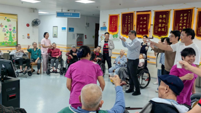 在三號樓四樓,平日里埋首工作的辦公室人員也完成了一次溫暖的身份轉換。他們隨著音樂穿梭在長者身邊,一同參與趣味游戲,并與老人們深情合唱《萬水千山總是情》,唱出了彼此間的牽掛與情誼。