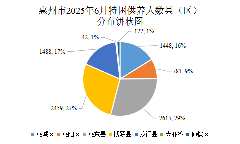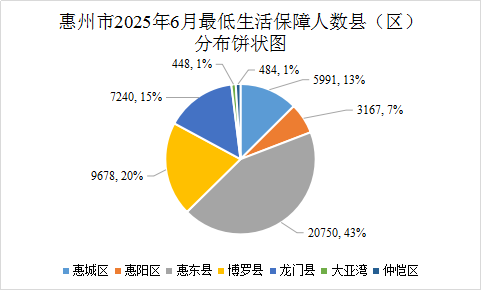 | 市縣區別 | 最低生活保障 | 特困供養 | | 戶數 | 人數 | 人數 | | 市合計 | 18870 | 47758 | 8955 | | 惠城區 | 2483 | 5991 | 1448 | | 惠陽區 | 1425 | 3167 | 781 | | 惠東縣 | 7873 | 20750 | 2615 | | 博羅縣 | 3996 | 9678 | 2459 | | 龍門縣 | 2708 | 7240 | 1488 | | 大亞灣 | 192 | 448 | 42 | | 仲愷區 | 193 | 484 | 122 |