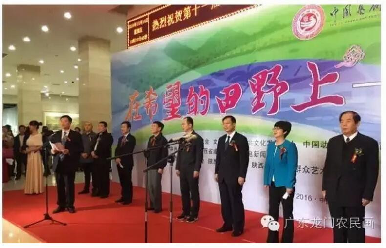 10月14日上午,作為第十一屆中國藝術節重頭戲的第十一屆中國藝術節“在希望的田野上”——中國農民畫精品展在陜西秦峰美術館隆重開幕。此展是由中國農民書畫研究會、文化部全國公共文化發展中心、中國動畫學會、陜西省文化廳主辦的全國最高規格的農民畫展,是對近年來中國農民畫創作成果的一次集中展示和檢閱,參展單位為文化部命名的“2014-2016年度中國民間文化藝術之鄉”中的26個農民畫鄉及特邀參展的3個農民畫鄉。國家、省市領導及來自全國農民畫鄉的代表和農民畫家、當地干部群眾、社會各界人士2000余人參加了開幕式。