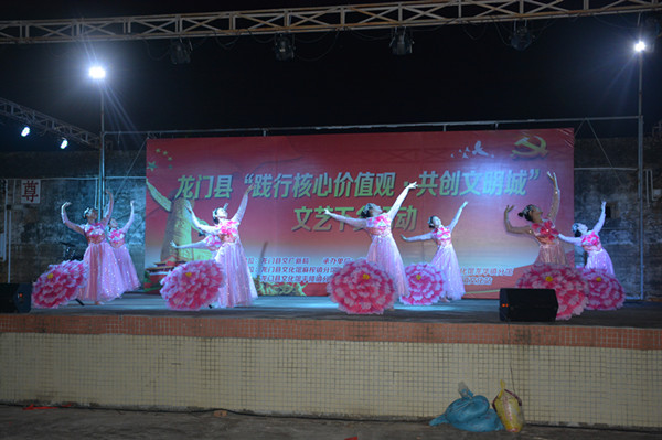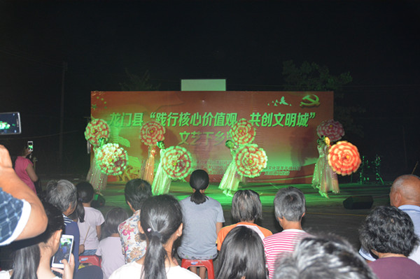 為加強核心價值觀宣傳教育,積極培育和踐行社會主義核心價值觀,提升廣大人民群眾的文明素質,共同創建全國縣級文明城市,由龍門縣文廣新局主辦,龍門縣文化館承辦,龍門縣文化館龍華鎮分館、龍田鎮文化站協辦的龍門縣“踐行核心價值觀·共創文明城”文藝下鄉活動于2017年6月27日和28日晚分別在龍田鎮李洞村、龍華鎮水坑村舉辦。<?xml:namespace prefix = o />