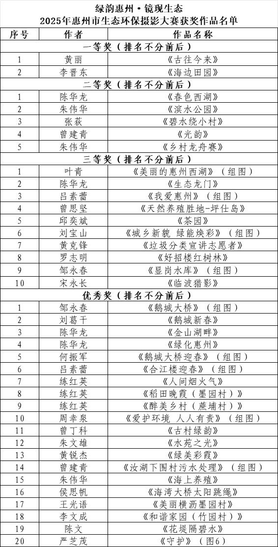綠韻惠州·鏡現生態 2025年惠州市生態環保攝影大賽圓滿落幕!活動自啟動以來,吸引了廣大攝影愛好者的積極參與,涌現出許多精彩紛呈的作品。經過專家評審團的嚴格評選,現將獲獎作品名單公布如下:
