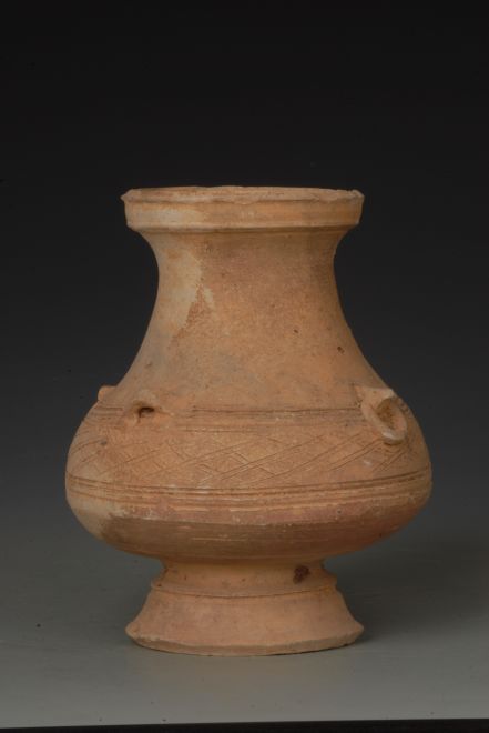 圓形的容器,其坯胎多系輪制,形狀規整,表面較光滑。除了隨著陶輪的旋轉而刻劃的少許平行的弦紋及一些局部幾何形劃紋和印紋以外,基本上是素面的。西漢前期,少數容器如甕、罐之類,偶爾還帶有一些不甚明顯的繩紋;西漢中期以后繩紋則基本上絕跡。有些灰陶器繪有彩色的花紋,稱“彩繪陶”,其花紋的陶器燒成后才繪描的,易于脫落。這種“彩繪陶”只發現于墓葬中,不見于居住址,可見是專為隨葬而作的。有些灰陶器表面涂漆,是模仿當時的漆器。戰國時代流行的陶豆在西漢前期還偶有所見,但不久即消失。戰國后期開始出現的陶鈁,盛行于西漢,東漢時已不見。戰國末年出現的造型奇特的“鴨蛋形壺”,流行于秦和西漢前期,西漢中期以后就極為少見。陶鼎和陶鐘是漢代最常見的仿銅陶器,流行的時期甚長。其他容器如甕、罐、盆、樽、盤、碗等,在整個漢代都大量存在,它們的形態隨著年代的推移而演變。西漢前期少數帶有繩紋的甕、罐等尚有為圜底的,從西漢中期以后,除了三足器和圈足器以外,幾乎所有的器物都為平底。還有一些日常用具如案、燈、熏爐及撲滿之類,既非飲食器,亦非一般的貯藏器,為前代所少見或未見。 隨著喪葬習俗的改變,漢代還盛行制作各種明器,種類甚多,數量很大,主要也屬灰陶的系統。最初出現的是倉和灶,在秦代和西漢前期的墓中即有所見,但普遍流行則在西漢中期以后。其他如井、磨、豬圈、樓閣、碓房、農田和陂塘等模型,以及豬、羊、馬、狗、雞、鴨等動物偶像,自西漢中期以后,相繼出現,到了東漢, 種類和數量均增多。在漢代,有大量各式各樣的陶俑用于隨葬。