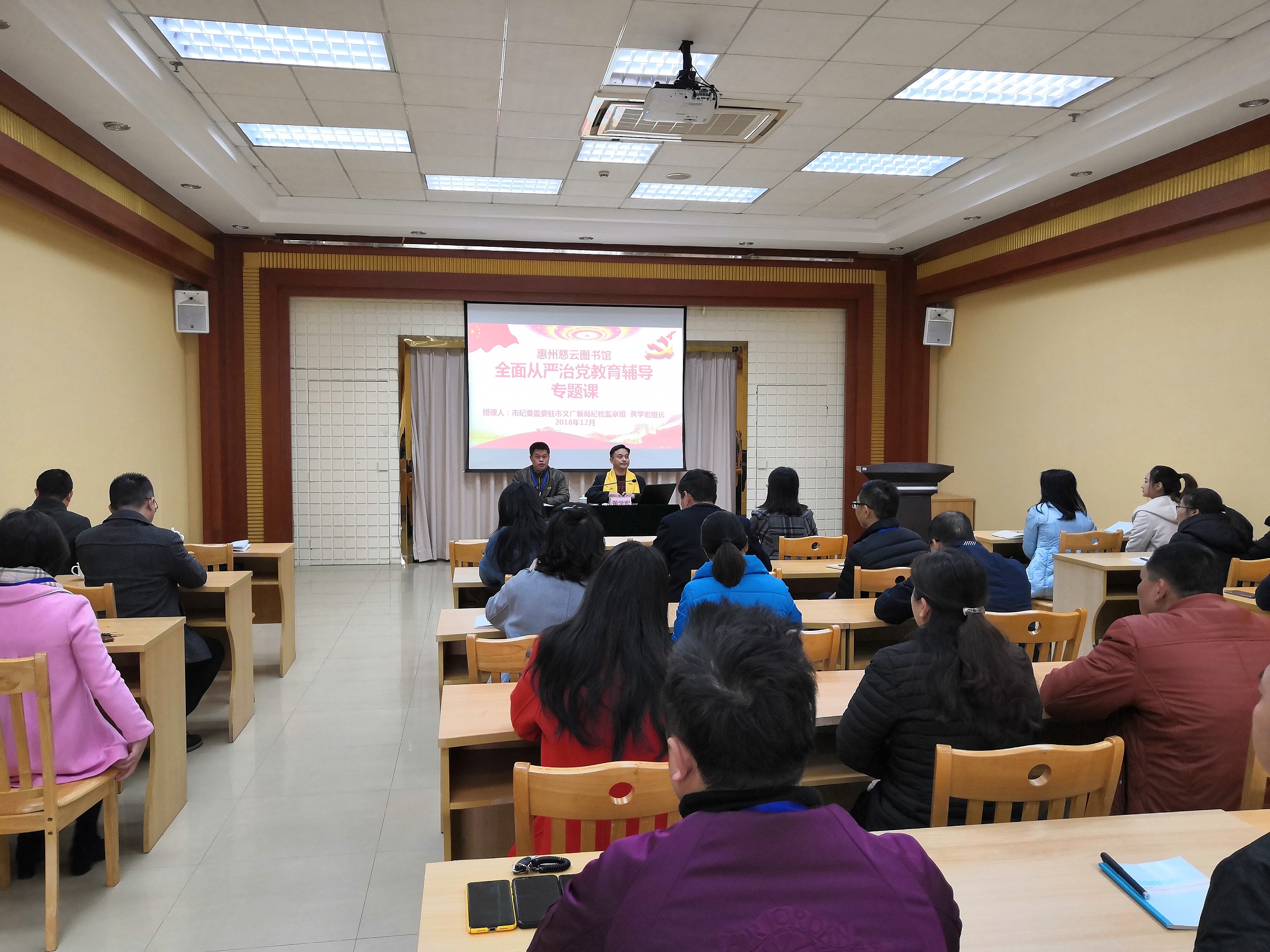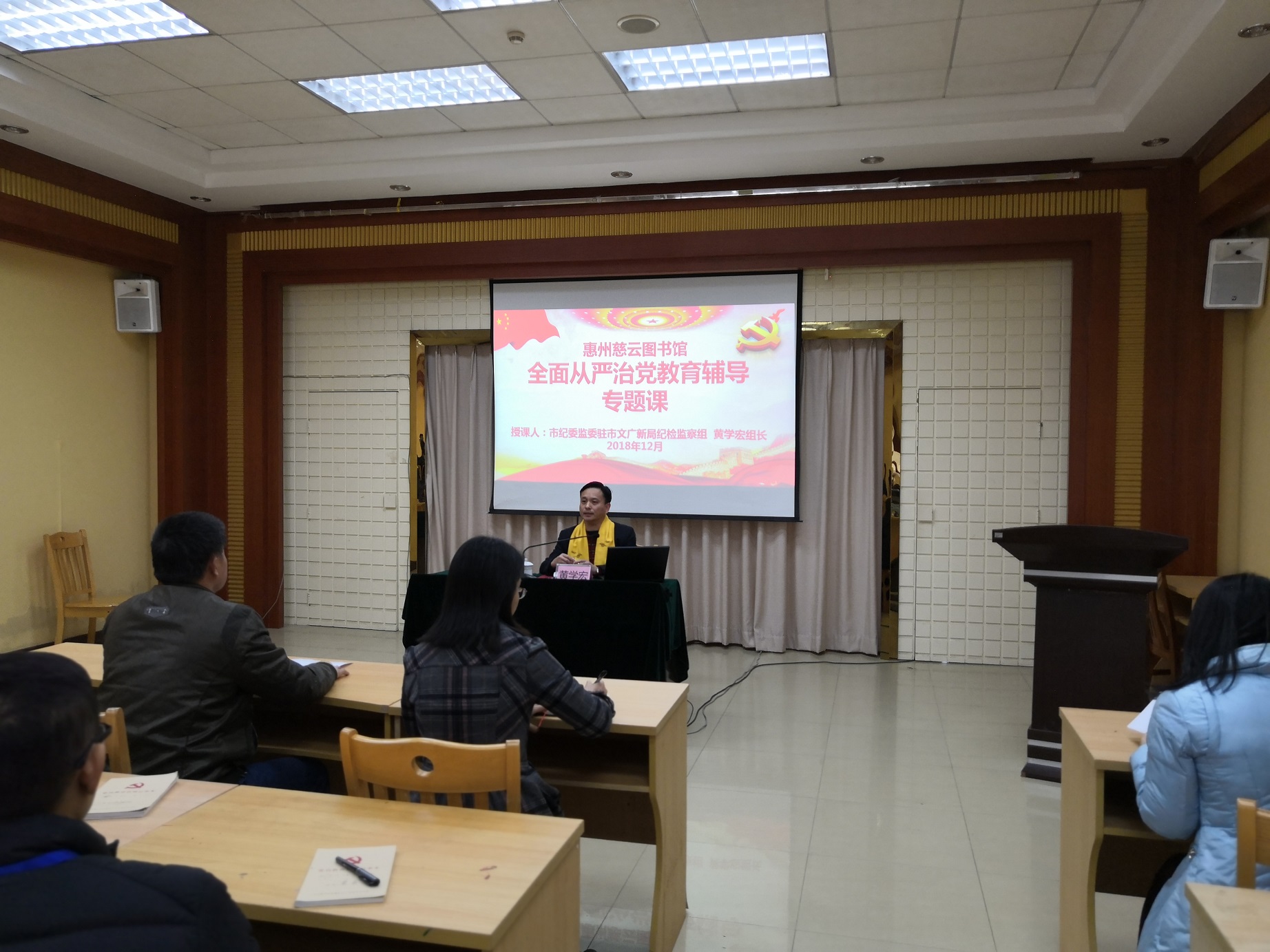 為深入學習貫徹黨的十九大對全面從嚴治黨的新論述、嚴要求, 12月14上午,市紀委監委駐市文廣新局紀檢監察組組長黃學宏到惠州慈云圖書館作了以“全面從嚴治黨永遠在路上”為主題的專題輔導課?;葜荽仍茍D書館黨支部全體黨員干部及職工共33人參加了黨課學習活動。