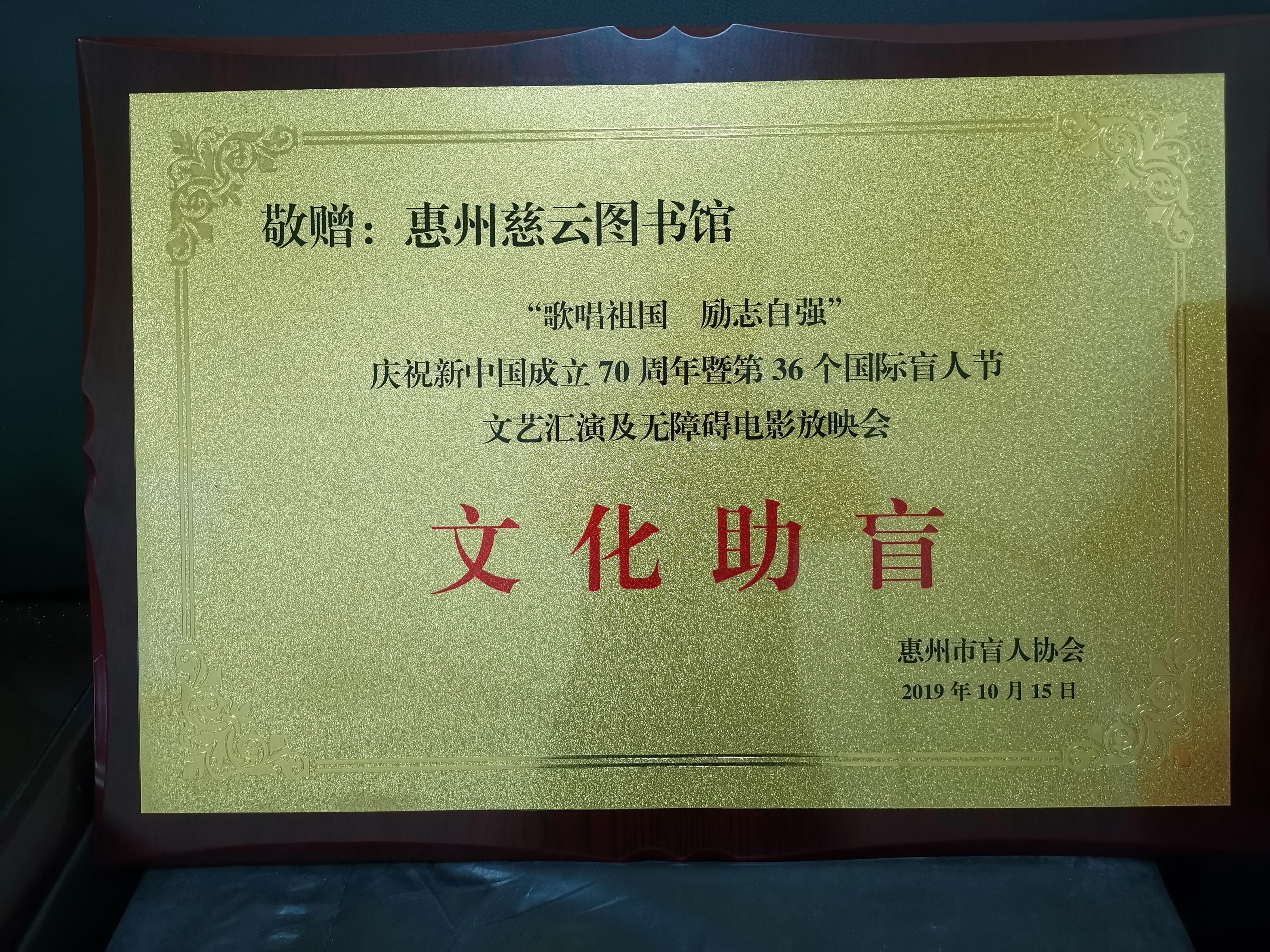 2019年10月15日是第36屆國際盲人節(jié),當天上午,惠州市盲協(xié)向惠州慈云圖書館贈送了“文化助盲”致謝牌匾,以表達視障人士對惠州慈云圖書館致力消除閱讀鴻溝,助推無障礙閱讀的感激之情。