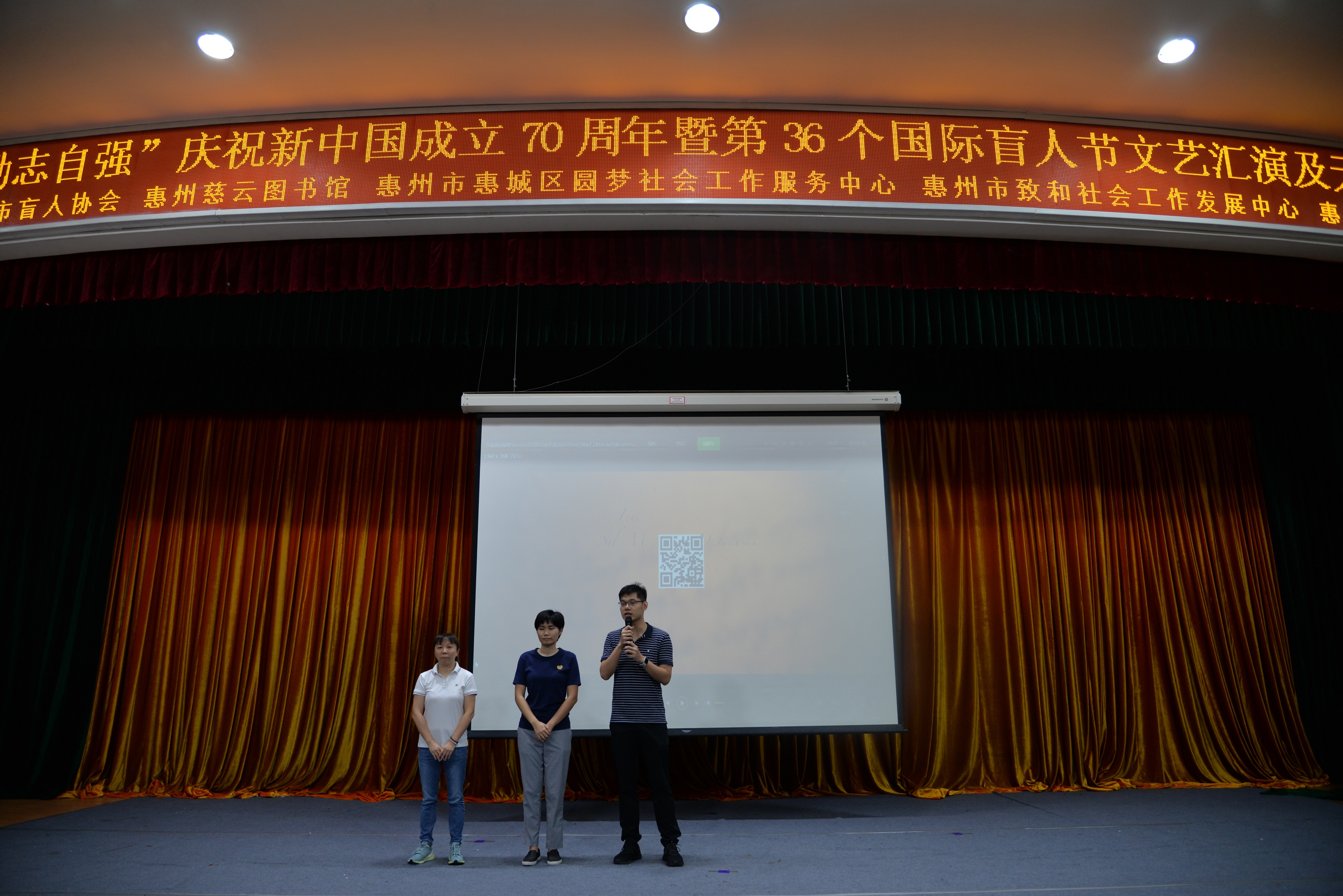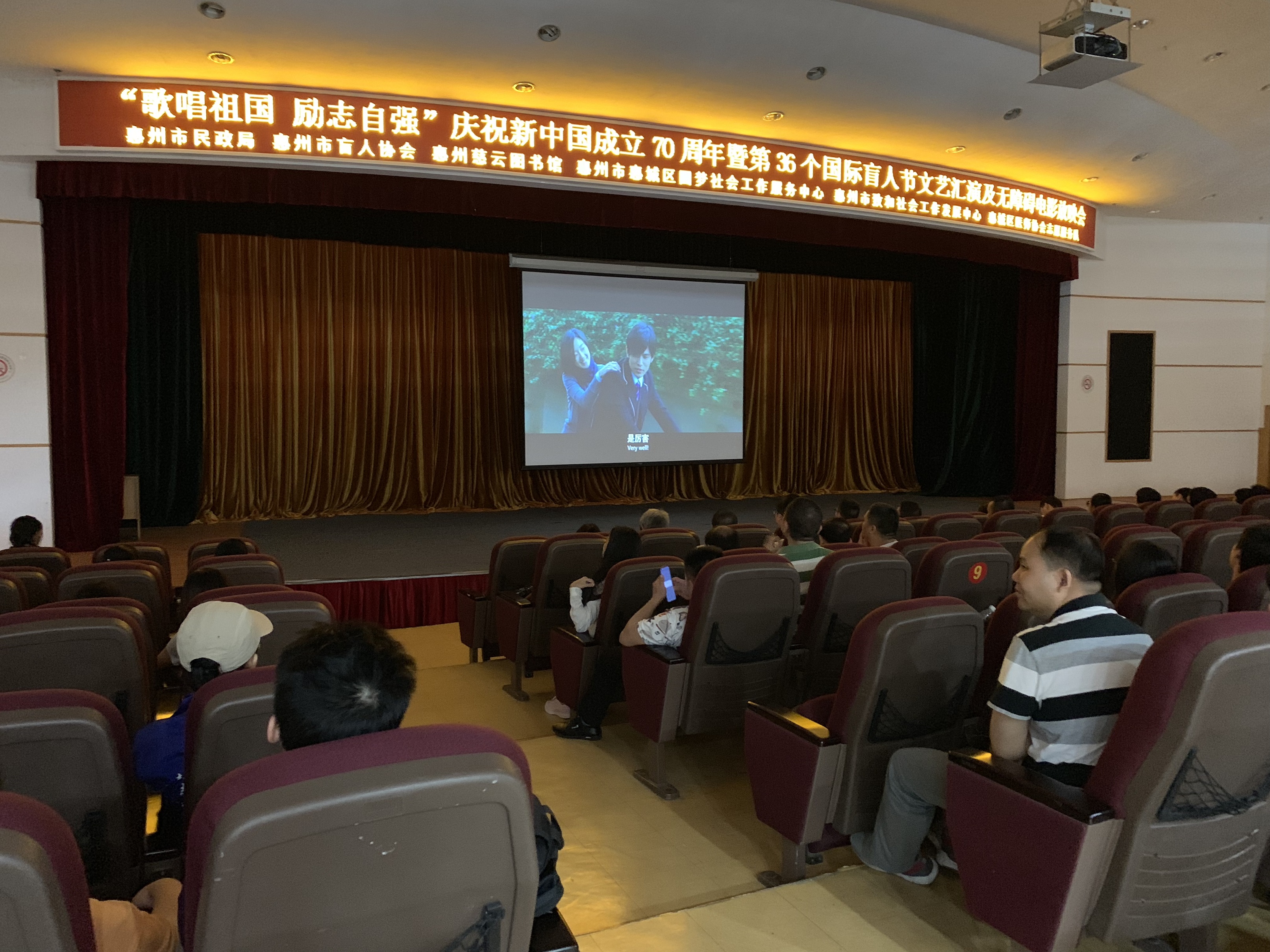 2019年10月15日是第36個國際盲人節,當天上午在惠州慈云圖書館報告廳舉行一場以“歌唱祖國 勵志自強”為主題的慶祝新中國成立 70 周年暨第 36 個國際盲人節文藝匯演及無障礙電影放映會。
