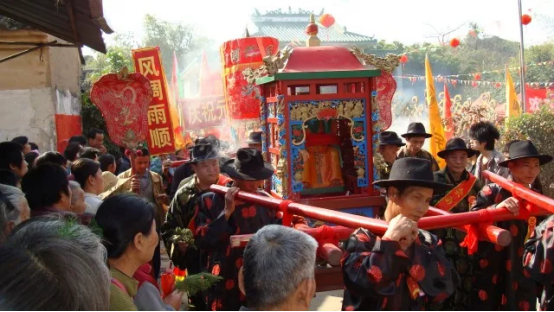 惠城區汝湖鎮仍圖真君宮巡游活動是惠州市非物質文化遺產項目,今年元宵節一如既往熱鬧舉行。汝湖鎮仍中村村民多姓陳,南新村村民多姓林,兩姓族人都是明末清初從福建移民過來的。移民到惠州后,由于水土不服,兩姓族人很多都生病了;幸虧得到了當地一位醫生的幫助,不少人得以痊愈。兩姓族人為感謝醫生的醫術與醫德,為醫生造“醫靈大帝”雕像;還修建了一座真君宮用于供奉。于是每年的元宵節,兩姓族人都身穿綢布袍褂,頭戴圓頂禮帽把“醫靈大帝”從真君宮請出來;由8名男子抬著花轎隊在兩個村子里巡游,祈求平安。