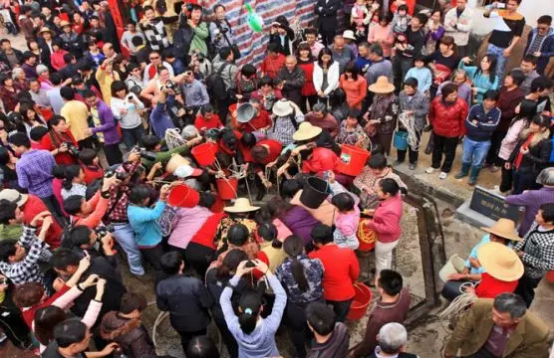 惠城區汝湖鎮仍圖真君宮巡游活動是惠州市非物質文化遺產項目,今年元宵節一如既往熱鬧舉行。汝湖鎮仍中村村民多姓陳,南新村村民多姓林,兩姓族人都是明末清初從福建移民過來的。移民到惠州后,由于水土不服,兩姓族人很多都生病了;幸虧得到了當地一位醫生的幫助,不少人得以痊愈。兩姓族人為感謝醫生的醫術與醫德,為醫生造“醫靈大帝”雕像;還修建了一座真君宮用于供奉。于是每年的元宵節,兩姓族人都身穿綢布袍褂,頭戴圓頂禮帽把“醫靈大帝”從真君宮請出來;由8名男子抬著花轎隊在兩個村子里巡游,祈求平安。 民俗關鍵字part 3:搶神水大戰